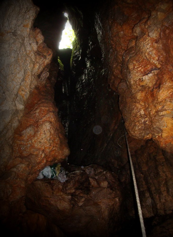 Raggiunto il fondo, fermandomi i canonici 10 minuti conteplativi (in mezzo ai rifiuti), risalgo il pozzo da 14, e un paio di metri sotto il frazionamento noto una finestrella… Mi ci infilo. Dopo una piccola strettoia mi affaccio su un pozzo inesplorato. Che fare? Beh, son sceso con un 150, recupero alla meno peggio un paio di cordini…..quindi via! …armo in naturale e si scende verso l’ignoto: …..un bel pozzo in erosione di 30 metri : porto così l’abisso a 120 metri di profondità.